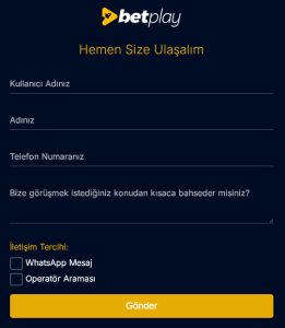 Betplay beni ara butonu kullanıcıların doğrudan müşteri hizmetleri ile görüşebilmesi için tasarlanmıştır. Aranma talep formu üzerinden telefon numaranızı paylaşarak destek ekibinden görüşme talep edebilirsiniz. Kullanıcı memnuniyetini ön planda tutan site çok yönlü iletişim seçeneklerine sahiptir.